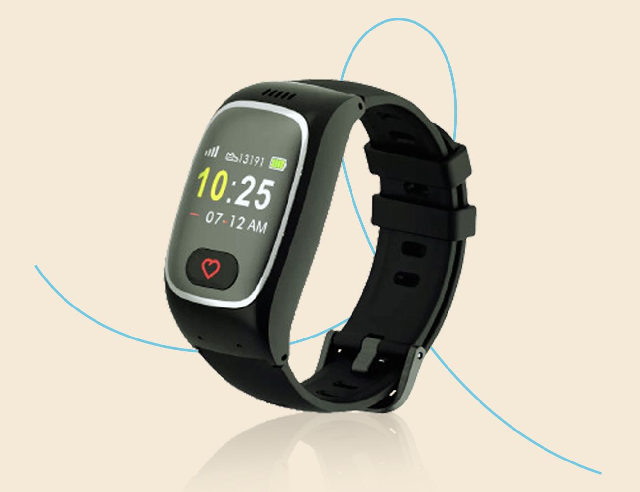 Relógio inteligente que acompanha sinais vitais, detecta quedas e envia alertas em tempo real.